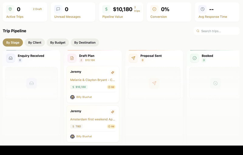 WhatsApp, email, SMS, in-app messaging — all unified in one inbox. No more switching between platforms to coordinate with advisors. Every conversation threaded, searchable, and linked to the trip it belongs to.